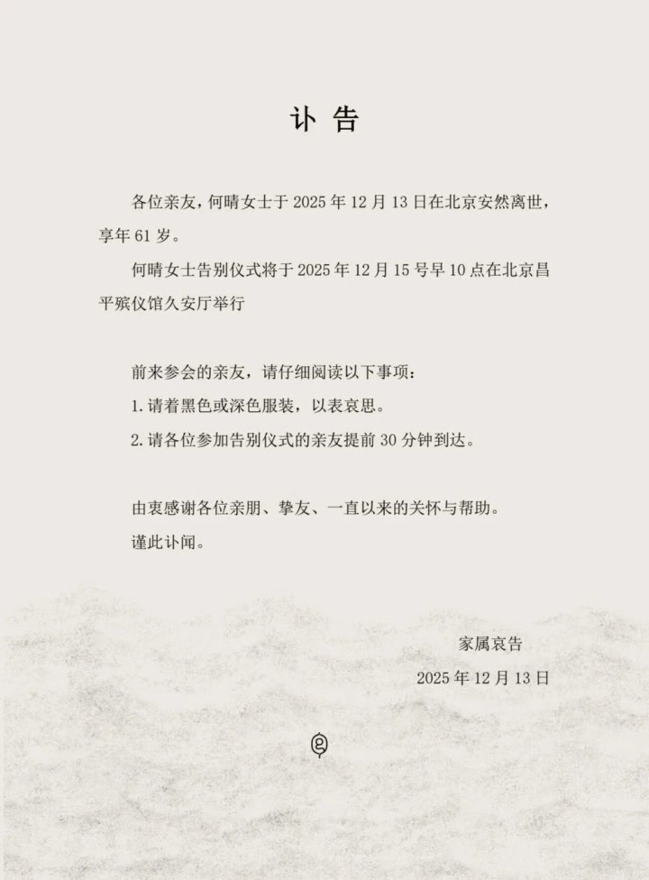 12月13日,一份家属发布讣告骄横,著明演员何晴在北京安祥离世,享年61岁。告别典礼将于2025年12月15日早10点在北京昌平殡仪馆久安厅举行。