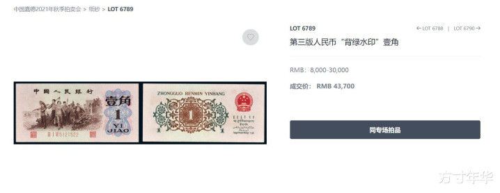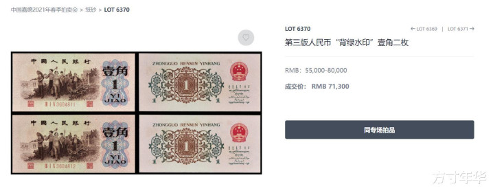 2021年嘉德锤击拍卖会成交了2张连号一角背绿带水印,品相九五成新至全新,成交价在7.13万元,平均一张也在3.5万多元;同庚秋季拍卖成交了一张九五成新,成交价在4.37万元。