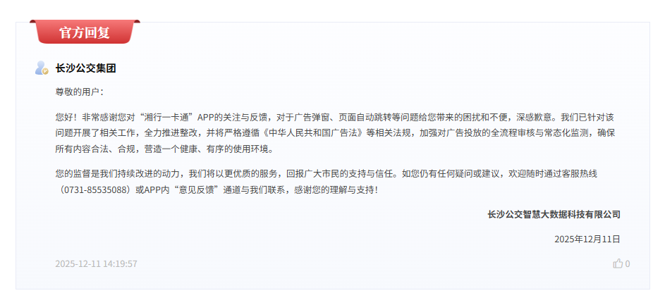 对此,长沙公错乱团作出回复,向用户致歉并示意全力鼓舞整改。回复称,集团已针对告白弹窗和页面自动跳转等问题开展了接头责任,全力鼓舞整改,并将严格遵从《中华东说念主民共和国告白法》等接头司法,加强对告白投放的全经由审核与常态化监测,确保统共实际正当、合规,营造一个健康、有序的使用环境。