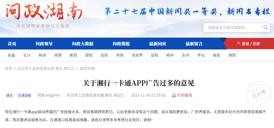 近日,网友在红网《问政湖南》等平台反馈,“湘行一卡通”App存在告白过多、易误触跳转等问题,严重影响使用体验。